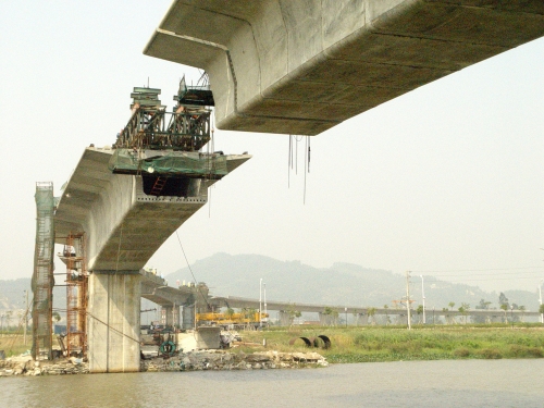 該標(biāo)段全長1.972公里,其中簡支梁橋長0.7公里。連續(xù)梁懸拼、簡支梁拼裝是地鐵四號(hào)線的兩大施工難點(diǎn),特別是連續(xù)梁懸臂拼裝是國內(nèi)首次應(yīng)用于地鐵施工。項(xiàng)目部自行設(shè)計(jì)簡易吊裝設(shè)備,采用無底吊籃優(yōu)化施工工藝,用電腦模擬拼裝來指導(dǎo)施工,并采用濕接縫或墊鋼片等方法細(xì)心糾正因預(yù)制帶來的偏差,確保連續(xù)梁懸臂拼裝的準(zhǔn)確性。簡支梁采用專門從挪威訂做的架橋機(jī)拼裝,較好地解決了簡支梁半徑?。ň€路平面最小半徑僅30米)、不易安裝的問題。