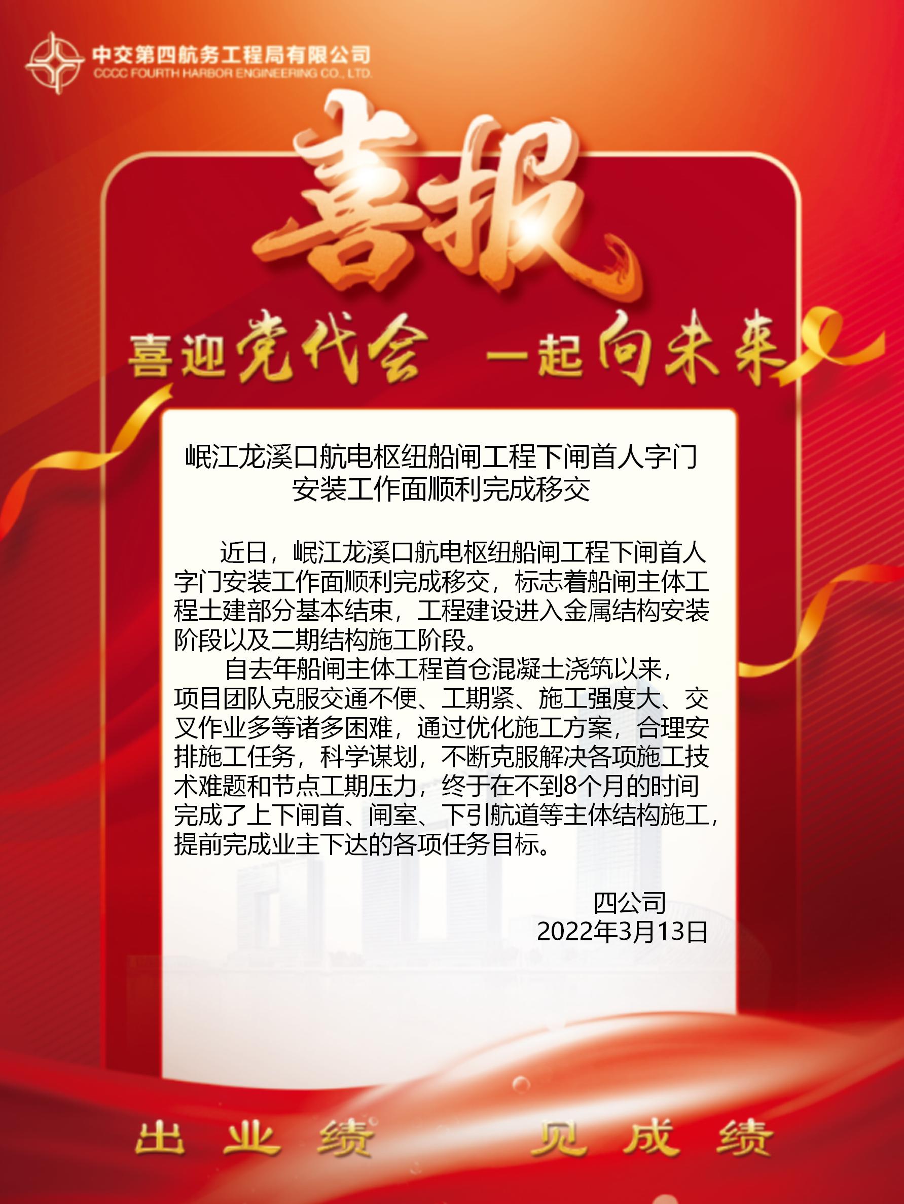 岷江龍溪口航電樞紐船閘工程下閘首人字門(mén)安裝工作面順利完成移交