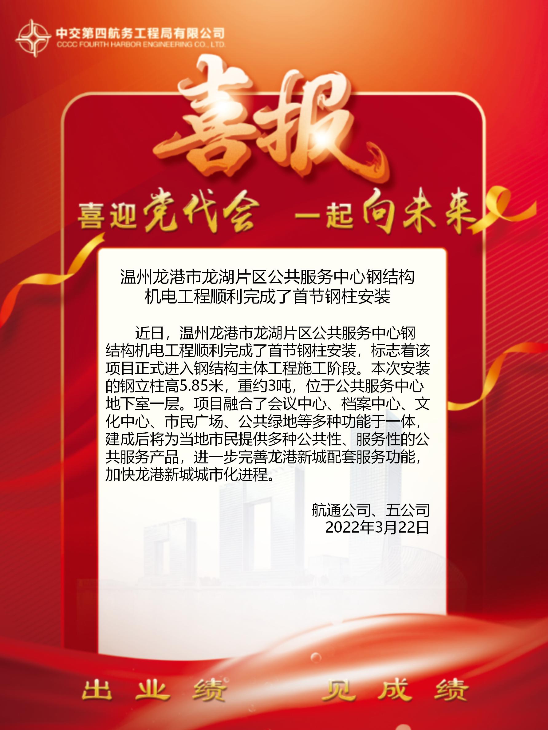 溫州龍港市龍湖片區(qū)公共服務(wù)中心鋼結(jié)構(gòu)機(jī)電工程順利完成了首節(jié)鋼柱安裝