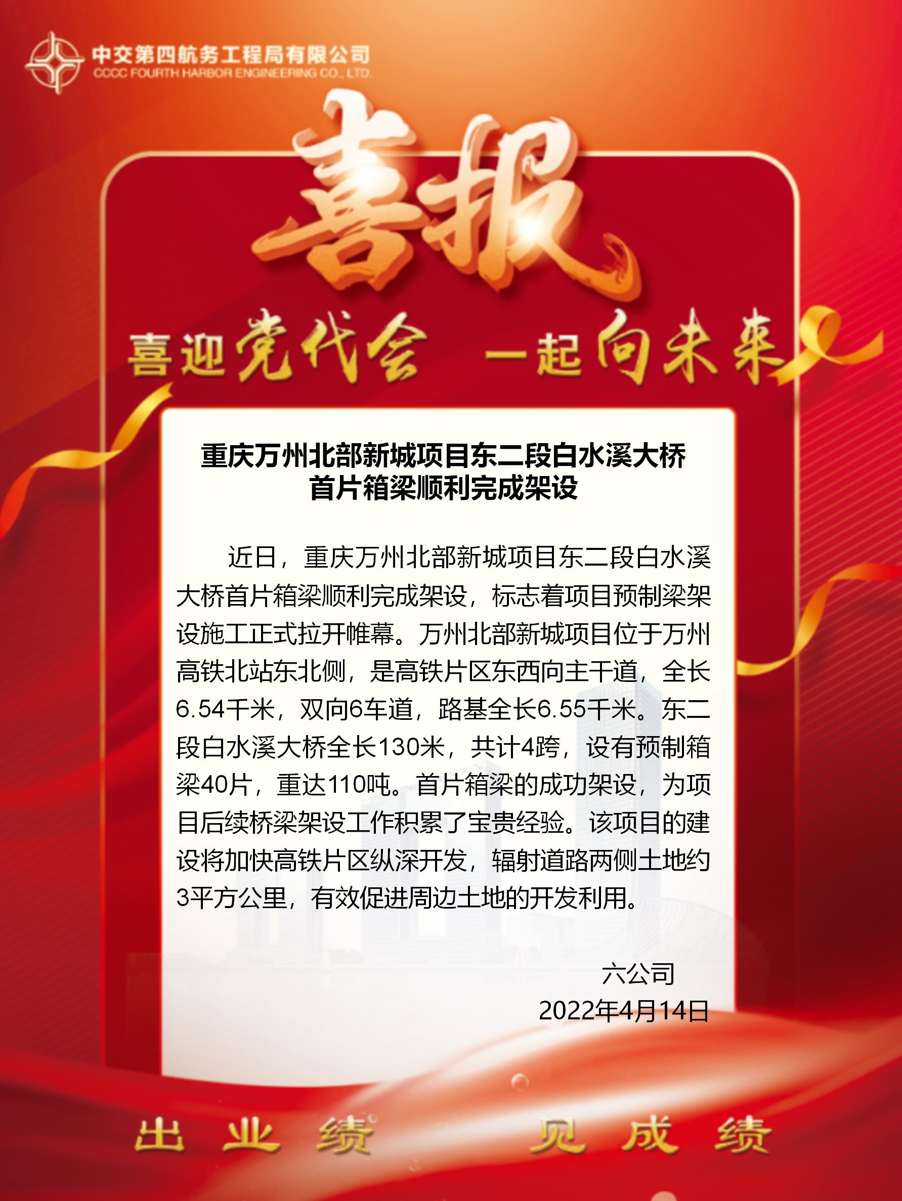 重慶萬州北部新城項目東二段白水溪大橋首片箱梁順利完成架設
