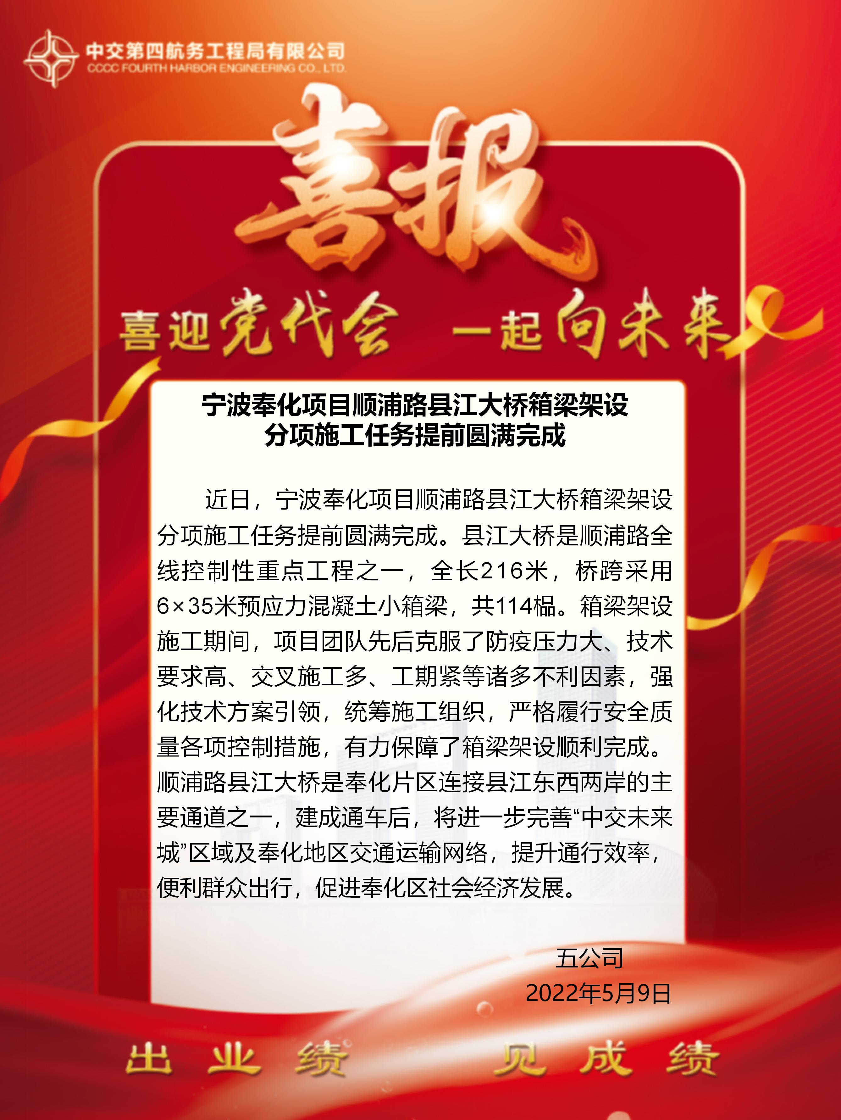 寧波奉化項(xiàng)目順浦路縣江大橋箱梁架設(shè)分項(xiàng)施工任務(wù)提前圓滿完成