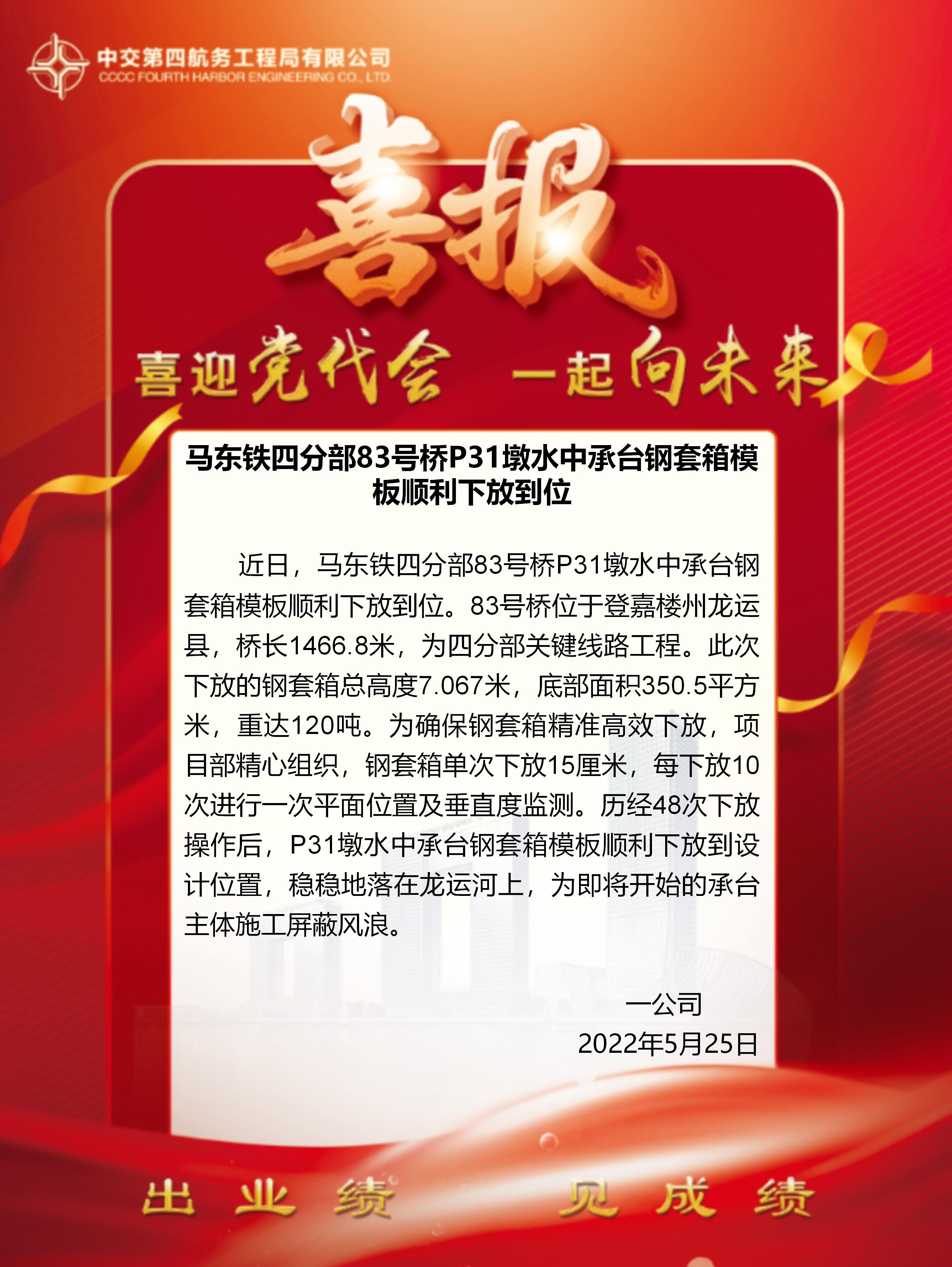 馬東鐵四分部83號(hào)橋P31墩水中承臺(tái)鋼套箱模板順利下放到位