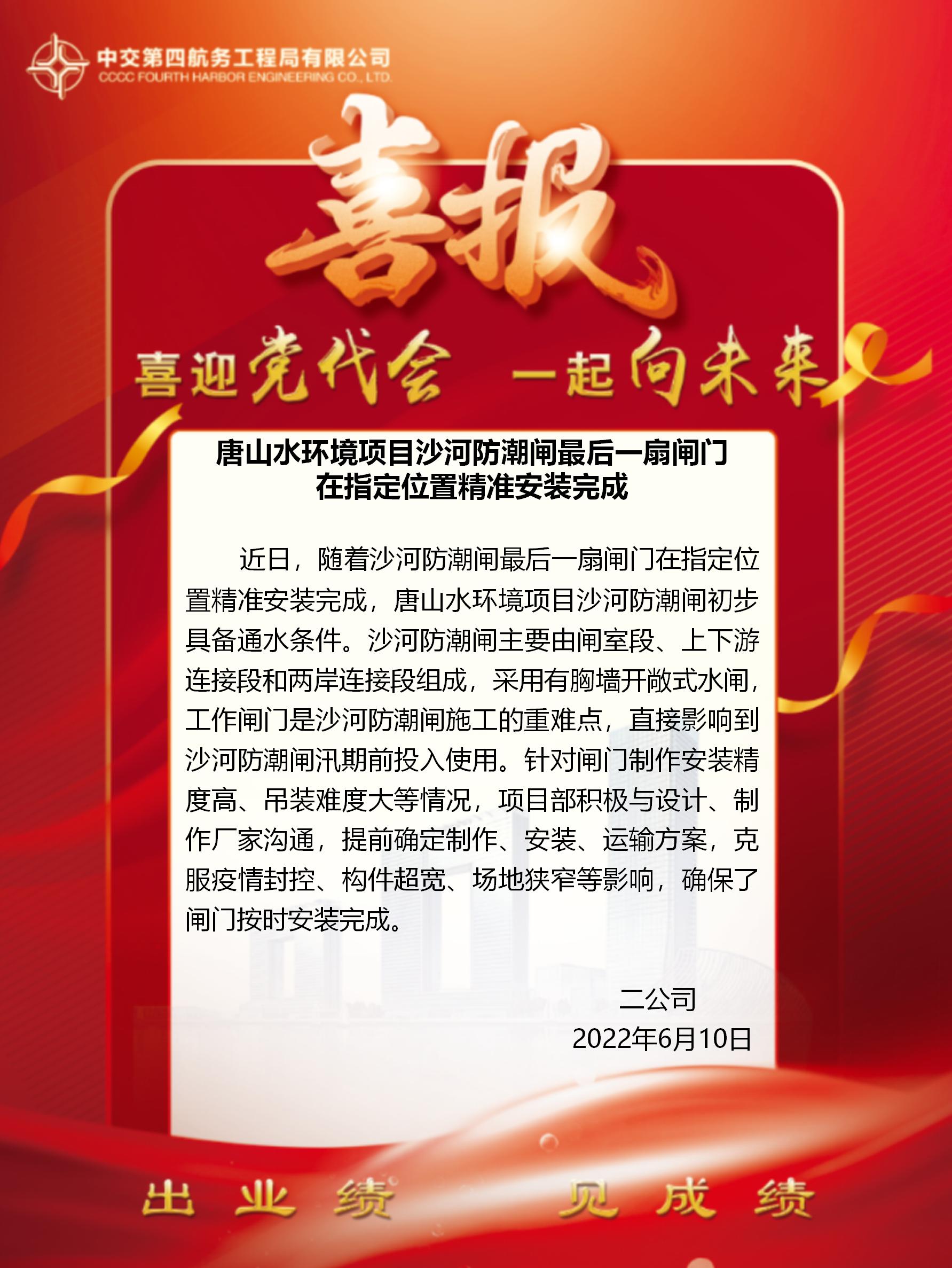 唐山水環(huán)境項目沙河防潮閘最后一扇閘門 在指定位置精準(zhǔn)安裝完成