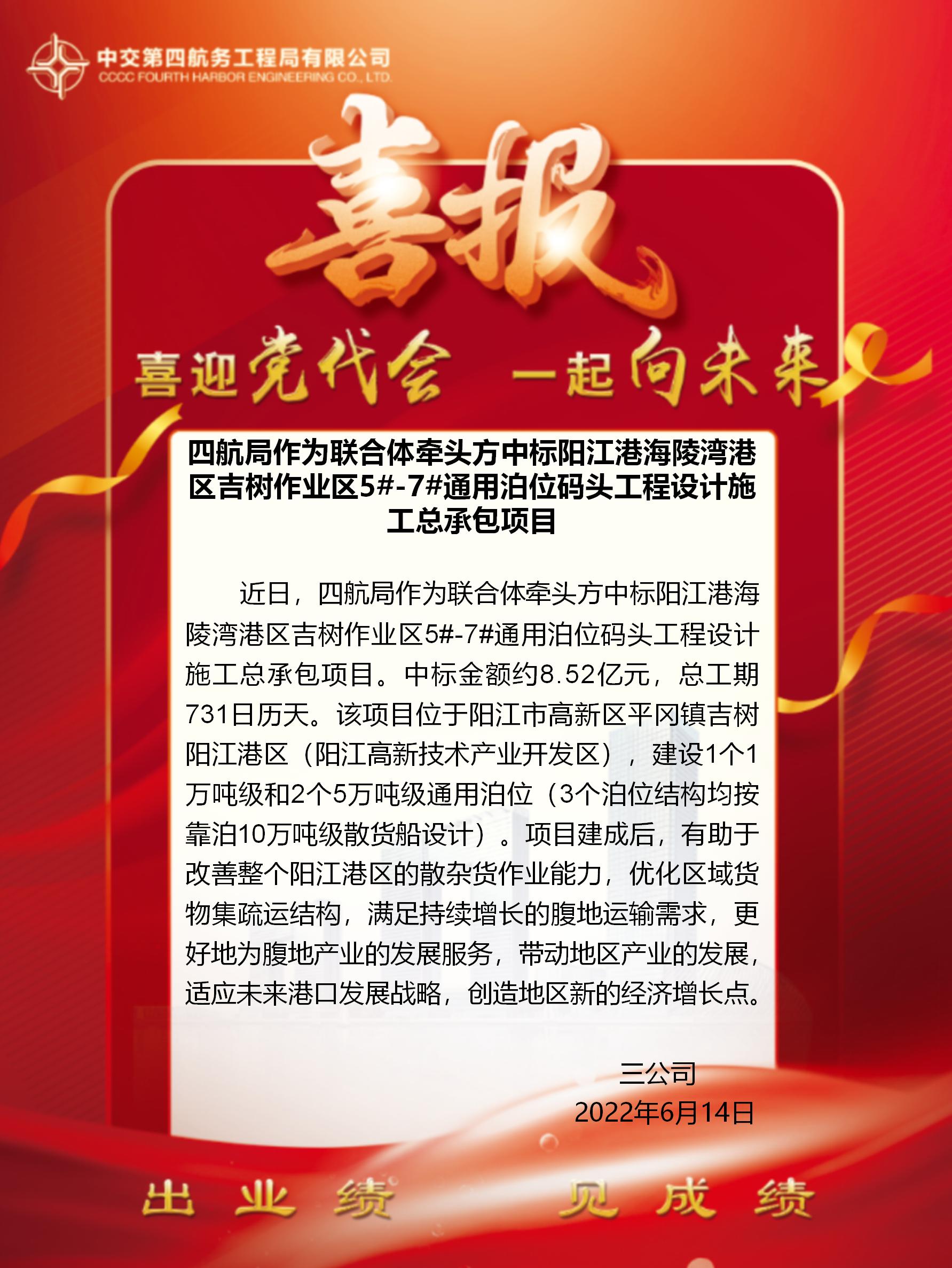 四航局作為聯(lián)合體牽頭方中標(biāo)陽江港海陵灣港區(qū)吉樹作業(yè)區(qū)5#-7#通用泊位碼頭工程設(shè)計施工總承包項目