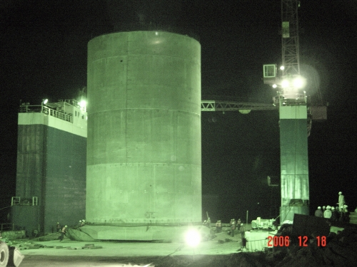 12月20日,福州分公司LNG項目部首件重1694噸的圓筒型沉箱出運安裝成功。該項目需13件重1694噸的大圓筒結(jié)構(gòu)沉箱,直徑12.5米、高21米;沉箱趾部為八角形,箱內(nèi)隔倉為"米"字格。該沉箱重心偏高,穩(wěn)定性差,給出運安裝帶來一定難度。