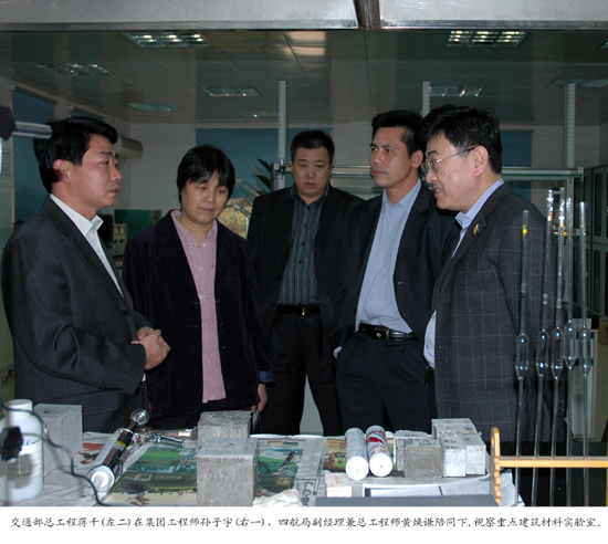 2月27日下午,交通部總工程師蔣千在中交集團總工程師孫子宇、四航局副總經(jīng)理兼總工程師黃煥謙的陪同下,到中交集團建筑材料重點實驗室視察。