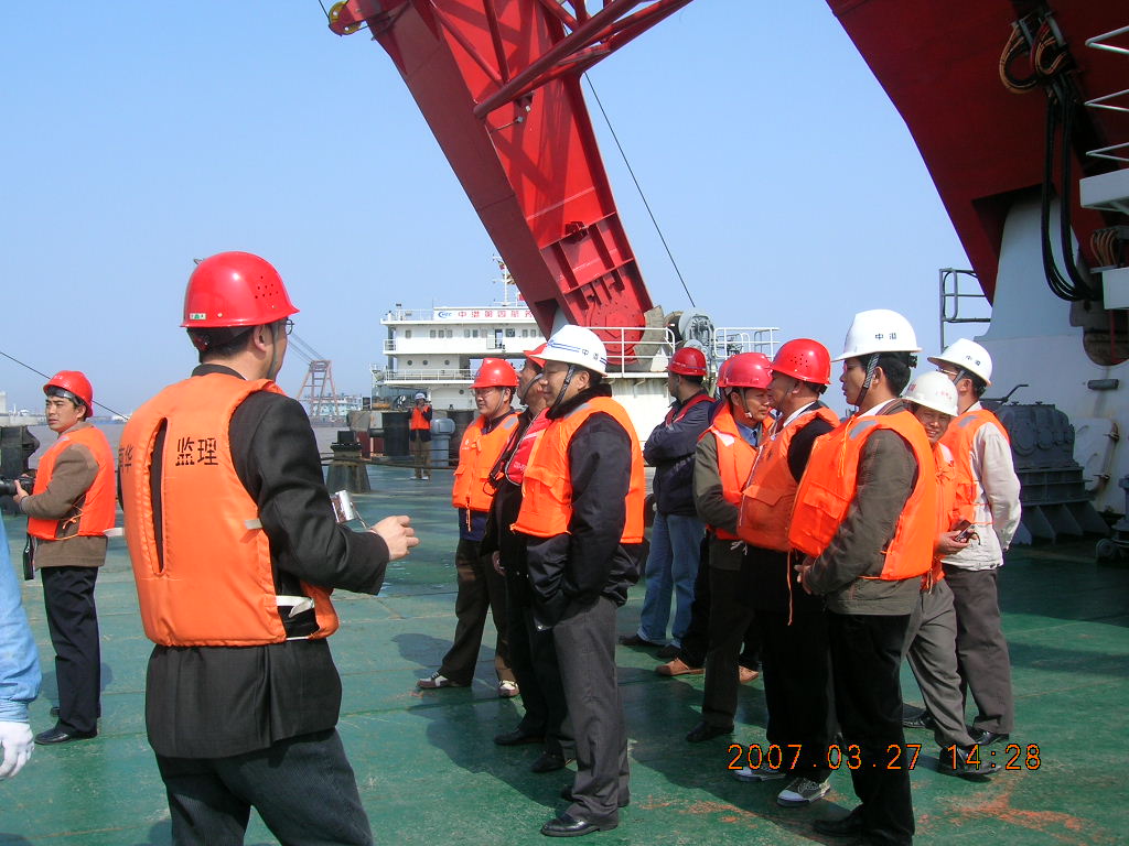 2007年3月27日下午,寧波金塘大橋項(xiàng)目工程指揮部由總指揮王助理和安監(jiān)處楊處長(zhǎng)帶隊(duì),組織所有參加金塘大橋建設(shè)的同仁單位團(tuán)隊(duì)到我局"四航奮進(jìn)"船上現(xiàn)場(chǎng)參觀學(xué)習(xí)。