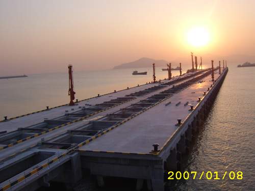 2007年4月26日,由三公司承建的中化格力港務(wù)有限公司石化公用碼頭工程通過(guò)由業(yè)主、質(zhì)檢站、監(jiān)理、設(shè)計(jì)等單位的聯(lián)合交工驗(yàn)收,工程質(zhì)量等級(jí)評(píng)定為優(yōu)良。珠海中化格力碼頭近期設(shè)計(jì)規(guī)模為1個(gè)5萬(wàn)噸級(jí),1個(gè)1萬(wàn)噸級(jí),3個(gè)2千噸級(jí)、3個(gè)1千噸級(jí)共8個(gè)泊位。結(jié)構(gòu)形式為突堤高樁梁板及高樁墩式結(jié)構(gòu)。