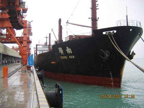 2007年4月25日下午,汕尾紅海灣發(fā)電廠7萬噸煤碼頭迎來了第一艘煤輪--"廣南"。該船靠碼頭上煤的成功,標志著汕尾煤碼頭正式投入使用。(林烏殿)