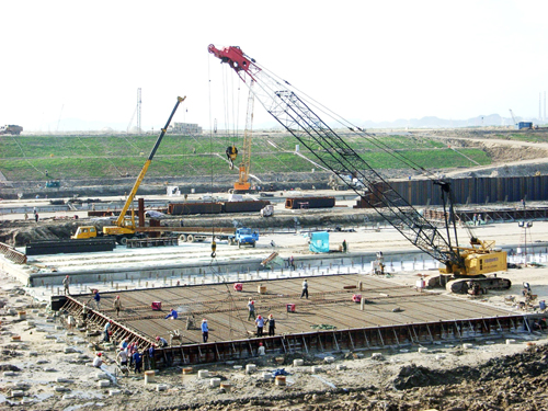 至6月上旬,已完成基坑開(kāi)挖159萬(wàn)立方米,占工程總量的96.2%;底板澆注任務(wù)已完成過(guò)半,兩個(gè)塢共完成48塊底板澆注;塢墻已澆注了三塊,第四塊正在加緊做好澆注前準(zhǔn)備;鋼板樁施工方面,AU16鋼板樁施工任務(wù)已全部完成,AU14鋼板樁完成了64%;圍堰下止水旋噴樁施工已全部完成;水泵房施工目前正朝著"6.15節(jié)點(diǎn)"沖刺,其底板澆注共需要混凝土2900立方米,屆時(shí),將持續(xù)施工60個(gè)小時(shí)。