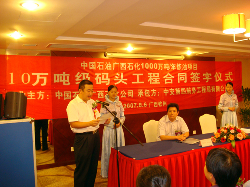 8月6日下午,中國石油廣西石化1000萬噸/年煉油項目10萬噸級碼頭工程施工合同簽約儀式在廣西欽州市白海豚大酒店隆重舉行,中國石油廣西石化公司總經(jīng)理吳恩來和四航局有限公司董事長、黨委書記梁卓仁分別代表建設(shè)單位和施工單位在合同上簽字。