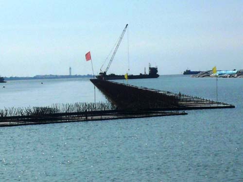 海口港二期碼頭工程預(yù)制及出運安裝沉箱共43件,有4種規(guī)格,最大沉箱的規(guī)格尺寸為21.4米×11米×14.8米,重1443噸。沉箱在??隈R村預(yù)制場預(yù)制,由四航防城港#浮船塢裝運到??诟鄱诖a頭工地安裝。在施工過程中,項目經(jīng)理陳偉組織有關(guān)人員深入討論與研究,并精心制定了"以沉箱安裝為主軸"整套施工方案。經(jīng)過項目部全體人員的共同努力,克服了一系列施工過程中出現(xiàn)的困難,緊緊抓住每一個可用潮汐的機(jī)會,終于完成了水下作業(yè)的關(guān)鍵一道工序-沉箱安裝,比業(yè)主要求提前半個月完成。