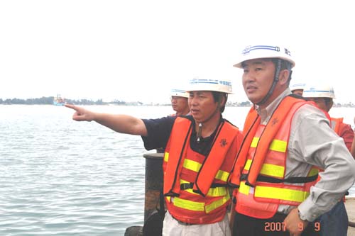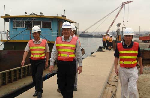 他察看了項(xiàng)目部預(yù)制場(chǎng)、主碼頭及離岸600米的油碼頭施工現(xiàn)場(chǎng),驅(qū)車到采石場(chǎng),登上多艘大型施工船舶全面了解工程進(jìn)展、石料開采運(yùn)輸情況和船容船貌、維修保養(yǎng)和船員生活情況。