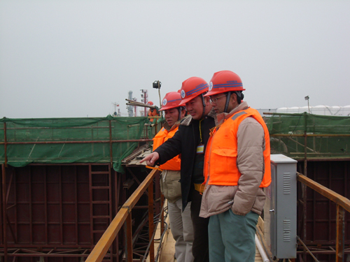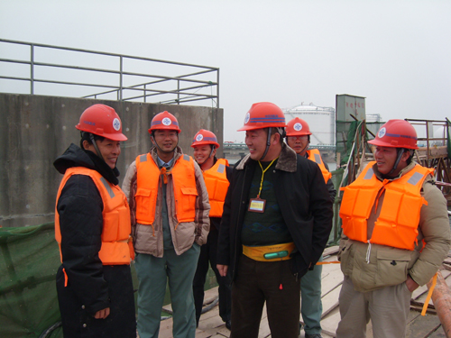 春節(jié)期間,四航局董事長梁卓仁在三公司副總經(jīng)理秦慶生的陪同下,冒著陣陣寒風(fēng)來到了欽州中石油10萬噸級碼頭工地,親切慰問春節(jié)期間堅(jiān)守在工地施工的所有員工。梁董事長還登上"防城港"號浮船塢及粵工拖"41"號等船組,拜訪業(yè)主并與業(yè)主領(lǐng)導(dǎo)進(jìn)行了親切地交談。