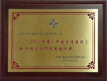 3月17日至18日,中交股份召開(kāi)了2008年度宣傳報(bào)道工作會(huì)議,總結(jié)中交股份2007年度宣傳報(bào)道工作情況,部署2008年宣傳報(bào)道重點(diǎn),同時(shí)表彰了一批宣傳報(bào)道工作先進(jìn)單位和個(gè)人,四航局被授予"2007年度《中國(guó)交通建設(shè)》報(bào)新聞報(bào)道工作優(yōu)秀組織獎(jiǎng)",何萬(wàn)華被授予"2007年度《中國(guó)交通建設(shè)》報(bào)優(yōu)秀記者"稱號(hào)。