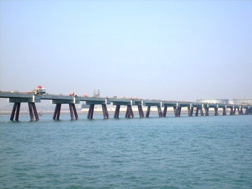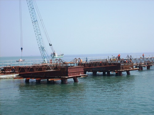 經(jīng)過項(xiàng)目部員工努力奮戰(zhàn),目前,引橋橋墩已全部澆注完成、引橋預(yù)應(yīng)力空心T字梁板連接510米、可通車引橋橋面近400米,完成工程總量的65%,大大提高了碼頭主體的施工效率。