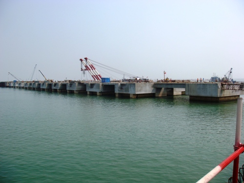 該項目自2007年6月份開工以來,三公司欽州港項目部不斷解放思想,實施技術創(chuàng)新,在施工中取得了重大突破。目前36萬立方米的基床拋石、整平以及40件沉箱的安裝已經(jīng)全部完成,胸墻澆注了30段,梁板安裝了300件,累計已完成產(chǎn)值達2.3億元,有望于今年6月份交付業(yè)主投入使用,比原計劃提前1個月完成。