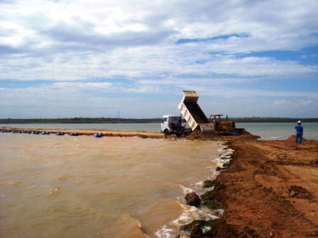 大型圍堰施工是漢班托塔項目的重點、難點,特別是圍堰的安全性、抗?jié)B抗漏性可謂整個項目成敗的關(guān)鍵。該工程圍堰總長4238米,布置在基坑周圍,圍堰結(jié)構(gòu)主要采用砂堤(或土堤)作為擋水結(jié)構(gòu),包括了圍堰挖泥、砂或土回填、塊石回填、強夯壓實等施工內(nèi)容。