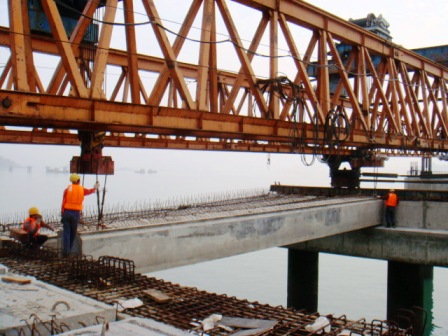 該工程共架設(shè)梁、板505件,構(gòu)件最長25.36米,最重59噸。采用一臺30m/80t架橋機,配備一套軌道運梁系統(tǒng)進行架設(shè)。