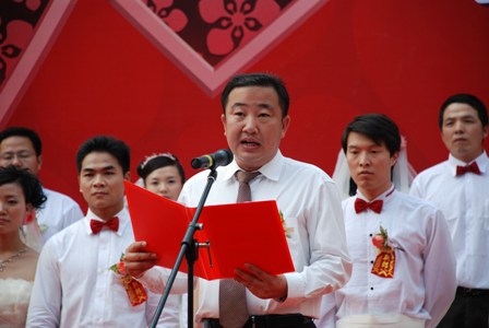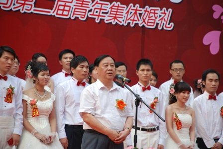 四航局董事長、黨委書記梁卓仁在婚禮上為25對新人主婚并致辭,希望他們在人生的道路上,做一對恩愛夫妻,互敬互愛、相濡以沫、同舟共濟(jì);在工作的征途中,做一對事業(yè)伴侶,相互學(xué)習(xí)、互相支持、互相勉勵,在各自的崗位上取得優(yōu)異的成績;同時,要尊老愛幼,孝敬父母,做父母的好兒女。