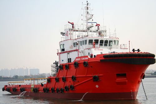 該船總長58.7米,型寬14.6米,型深5.5米,總噸1537噸,系柱拖力65噸;航行無限航區(qū),是用于海上石油平臺的拖帶,錨碇作業(yè),消防,安全救助等多用途工作船;該船具有DP(動態(tài)定位)功能;入級法國船級社(BV)。