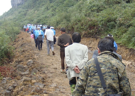 項(xiàng)目部一工區(qū)駐地毗鄰光坡村泡木坪寨,該寨與一工區(qū)進(jìn)場(chǎng)施工便道直線距離約4公里,居住著幾百名苗族村民。由于泡木坪寨被大山環(huán)繞,沒有道路通往外界,村里小孩上下學(xué)及村民進(jìn)出山極為不便,尤其是遇到雨季更是舉步維艱。項(xiàng)目部的人員看在眼里,急在心里,主動(dòng)提出義務(wù)為村民修路,歷時(shí)半個(gè)月完成了一條寬4米,長5.5公里的山區(qū)鄉(xiāng)村道路。木坪寨村民為感謝四航局,于工區(qū)進(jìn)場(chǎng)便道上樹立"感謝信"宣傳牌,并邀請(qǐng)施工人員到寨里做客。并有40多名村民身著民族服裝,冒著細(xì)雨,自發(fā)性地來到一工區(qū)駐地,為施工人員跳起了民族舞蹈,對(duì)施工人員近半個(gè)月的艱苦努力表示感謝。