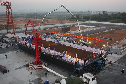 為了保證首片預(yù)制箱梁澆筑成功,南海制梁場采取了多樣措施。一是細(xì)化施工方案,對電力、材料供給和設(shè)備使用、操作流程等方面制訂詳細(xì)的保證措施和應(yīng)急預(yù)案。二是對所有作業(yè)人員進(jìn)行安全、技術(shù)培訓(xùn),對每道工序開展作業(yè)演練。三是嚴(yán)格控制原材料質(zhì)量,對砂進(jìn)行篩選,確保大小勻稱;對碎石進(jìn)行沖洗,保證無雜質(zhì);對鋼筋水泥嚴(yán)格檢驗,合格才進(jìn)場。四是經(jīng)過反復(fù)測試優(yōu)選混凝土配合比,試拌后送鐵道部質(zhì)量檢測中心進(jìn)行檢測,確保配合比既能滿足生產(chǎn)和技術(shù)要求,又能有效控制施工成本。