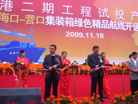 11月18日上午,??诟鄱诠こ淘囃懂a暨中國海運海口-營口精品集裝箱航線開通儀式隆重舉行,海南省副省長李國梁、??谑形瘯涥愞o、四航局董事長梁卓仁等領導出席了該儀式。