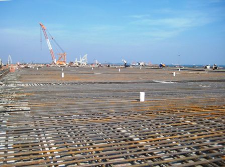 該工程為高樁梁板結(jié)構(gòu),碼頭長度678米,碼頭沉樁基668根,預(yù)制安裝構(gòu)件1454件,現(xiàn)澆混凝土2.9萬方,護岸拋石44萬方,后方回填砂振沖密實78萬方。橫梁部分采用C50高性能混凝土,共80條,單根混凝土方量118方。目前,現(xiàn)澆施工進展順利,樁帽、橫梁已澆注完成,現(xiàn)澆面層及磨耗層施工將全面展開,項目部正搶趕進度,爭取在12月底全面完成混凝土的澆筑任務(wù),完成年度施工計劃。