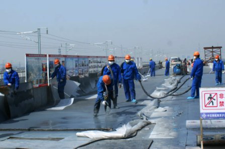 在防水層施工中,京滬高鐵項目部遵照"試驗先行,樣板引路"理念的指引,積極探索創(chuàng)新。2009年12月15日,該部順利承辦京滬高鐵全線防水層施工現(xiàn)場觀摩會,成為全線學習的樣板工區(qū);今年1月4日,又在全線參建單位中脫穎而出,成為全線首個防水層施工通過驗收的單位。歷時199天的不懈努力,項目部最終順利完成全部防水層施工任務(wù),為后續(xù)軌道板鋪設(shè)提供了有利條件。