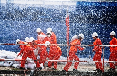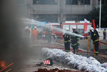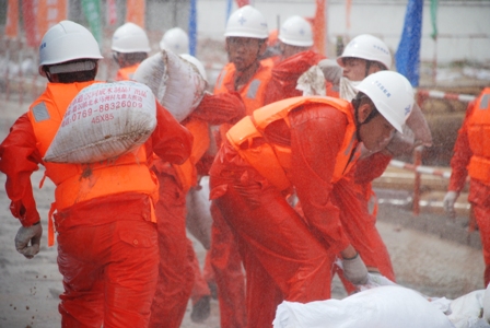 本次演習(xí)是中交股份廣泛深入開展"安全生產(chǎn)月"的一項(xiàng)重要活動,演習(xí)結(jié)合華南地區(qū)臺風(fēng)多發(fā)的實(shí)際,針對目前社會關(guān)注的坍塌問題,共模擬防臺、圍堰防洪、塔吊加固、基坑坍塌、天然氣爆炸失火及人員疏散等六個(gè)場景。