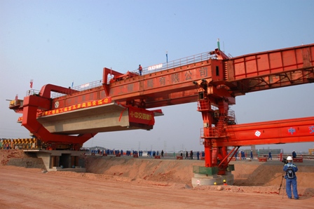設(shè)計時速200公里的貴廣鐵路是國家和鐵道部重大投資項目之一,四航局承建貴陽至廣州鐵路站前工程GGTJ-13標(biāo)段,全長38.67公里,共需預(yù)制架設(shè)452孔箱梁。每片箱梁長32.6米、寬12.2米、高3.09米、重760噸,四航局貴廣二項目部采用1臺900噸運梁車和1臺900噸架橋機配合進(jìn)行運梁和架設(shè)?,F(xiàn)場人員嚴(yán)格按照預(yù)先制定的方案和操作規(guī)程,環(huán)環(huán)相扣、精心操作,確保了箱梁架設(shè)既安全順利,又精確到位。