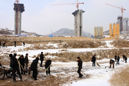 為了盡快恢復(fù)施工生產(chǎn),大雪一停,項目部領(lǐng)導(dǎo)便帶領(lǐng)施工人員拿著鐵鍬、掃帚開始除雪鏟冰。大家不畏嚴寒,團結(jié)協(xié)作,經(jīng)過近三個小時的共同努力,成功將攪拌站至溫河大橋5號墩的施工便道積雪清掃一空。隨后,項目部安排裝載機在清掃出來的路面鋪上碎石粉,為攪拌車將混凝土安全輸送到5號墩滑模施工現(xiàn)場提供了可靠保障。