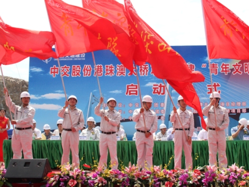 首先,中交四航局黨委副書記張猛致歡迎辭,希望在“青年文明號”創(chuàng)號過程中,四航局各級團(tuán)組織虛心學(xué)習(xí)各兄弟單位的先進(jìn)經(jīng)驗(yàn),查找差距,推動(dòng)公司團(tuán)的工作再上新臺(tái)階;廣東團(tuán)省委副書記陳小鋒強(qiáng)調(diào),在中交股份各級黨政領(lǐng)導(dǎo)的高度重視和關(guān)心支持下,中國交通建設(shè)港珠澳大橋項(xiàng)目的團(tuán)組織一定能夠發(fā)揮創(chuàng)先爭優(yōu)的排頭兵作用,發(fā)揮青年突擊隊(duì)文明施工、節(jié)能降耗、攻堅(jiān)克難的先鋒隊(duì)作用,高標(biāo)準(zhǔn)、高質(zhì)量、高水平地完成港珠澳大橋的建設(shè)任務(wù),為國家的交通建設(shè)事業(yè)再立新功;中央企業(yè)團(tuán)工委書記許高峰肯定了項(xiàng)目前期工作,并表示攻堅(jiān)的階段才剛剛開始,在這樣一個(gè)世界矚目的大舞臺(tái)上,在這樣一個(gè)以青年人為主體的項(xiàng)目團(tuán)隊(duì)中,結(jié)合項(xiàng)目施工生產(chǎn)的實(shí)際和青年人成長成才的需要,積極主動(dòng)開展創(chuàng)建“青年文明號”和“青年突擊隊(duì)”活動(dòng),是非常有意義的,這必將進(jìn)一步激勵(lì)央企青年敬崗愛業(yè),攻堅(jiān)克難,再創(chuàng)新績;中交股份黨委副書記楊力強(qiáng)要求奮戰(zhàn)在一線的青年團(tuán)員要以科學(xué)發(fā)展觀為指導(dǎo),以高度的工作責(zé)任心和科學(xué)的管理手段,通過全過程的精細(xì)管理,全方位的高品質(zhì)施工,全力以赴將港珠澳大橋項(xiàng)目打造成精品工程、科技創(chuàng)新工程和人才工程,打造成世紀(jì)工程的典范,譜寫中交在世界級跨海通道建設(shè)史上的新篇章,為國家、為民族爭光。最后,領(lǐng)導(dǎo)及來賓為各參建單位青年突擊隊(duì)授旗。