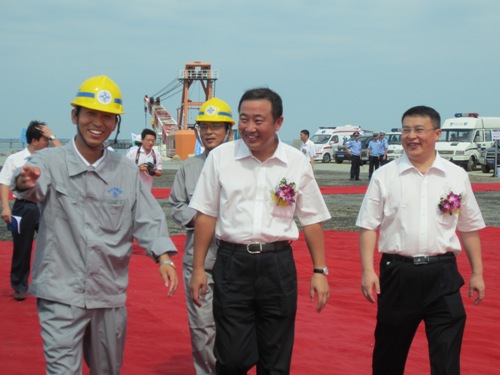 廣東省委常委、常務(wù)副省長朱小丹在湛江市委書記、市人大常委會主任劉小華,四航局董事長、黨委書記梁卓仁等人陪同下,來到北護(hù)岸觀禮臺,察看了30萬噸大型散貨碼頭的沉樁施工,梁卓仁向朱小丹介紹了30萬噸大型散貨碼頭的施工組織與計劃。