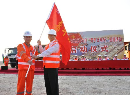 又訊 10月11日,四航局總經(jīng)理孫國強、中國港灣集團(tuán)副總經(jīng)理莫文賀、四航局副總經(jīng)理李惠明等領(lǐng)導(dǎo)出席了多哈新港項目部“青年文明號”活動啟動儀式??偨?jīng)理孫國強為青年突擊隊授旗。