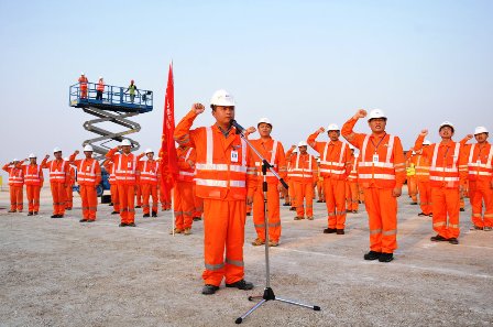 全體青年突擊隊員莊嚴(yán)宣誓:決心將以一流的技術(shù)、一流的管理、一流的業(yè)績,在美麗的波斯灣之濱,建造雄偉壯麗的現(xiàn)代化海港;用青春和智慧、激情和汗水,擦亮四航品牌,拓展中交集團(tuán)大海外發(fā)展戰(zhàn)略,向卡塔爾人民和祖國人民交出一份滿意的答卷。