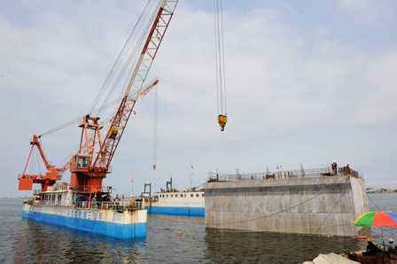 洛比托擴(kuò)建項(xiàng)目礦石碼頭共預(yù)制沉箱19件,單件長(zhǎng)18.7米、寬14.3米、高17.3米,約重2200噸,是迄今為止安哥拉境內(nèi)規(guī)模最大的沉箱。綜合考慮成本、工期、人力資源等因素,項(xiàng)目部沒(méi)有引進(jìn)專業(yè)分包隊(duì)伍施工,自行組織由技術(shù)員、施工班長(zhǎng)帶頭、當(dāng)?shù)貏诠橹髁姷氖┕ぐ嘟M施工,把整個(gè)施工工藝流程逐個(gè)分解量化,并認(rèn)真落實(shí),確保了整個(gè)施工計(jì)劃如期完成。該項(xiàng)目19件沉箱安裝面平線順,相鄰沉箱高差不超過(guò)5厘米,縫隙不超過(guò)5厘米,得到了南華監(jiān)理、中港和外國(guó)咨工的一致贊賞。