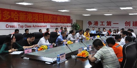 李惠明一行視察了施工現(xiàn)場(chǎng),了解重要分項(xiàng)工程的建設(shè)情況及施工進(jìn)度,并出席了多哈新港項(xiàng)目部員工座談會(huì)。會(huì)上,李惠明對(duì)項(xiàng)目部全體員工在艱苦環(huán)境中付出的努力給予了肯定,對(duì)員工的身心健康和年輕員工的發(fā)展表示關(guān)心和慰問。