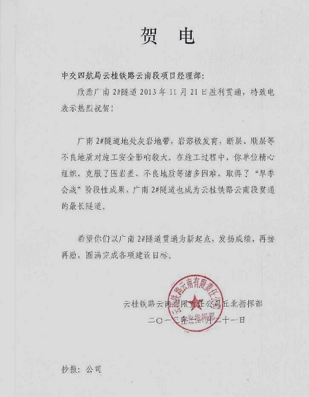 業(yè)主丘北指揮部在賀電中指出:“在施工過(guò)程中,你單位精心組織,克服了圍巖差、不良地質(zhì)等諸多困難,取得了旱季會(huì)戰(zhàn)階段性成果,廣南2號(hào)隧道也成為云桂鐵路云南段貫通的最長(zhǎng)隧道”。