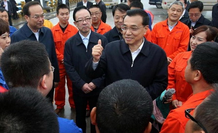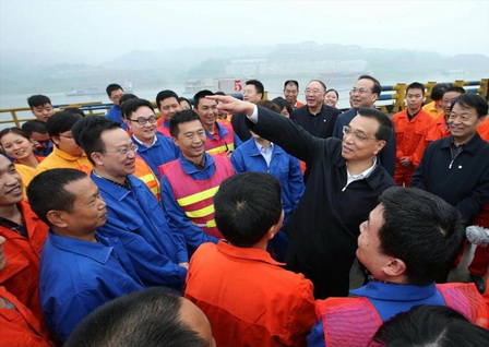 李克強經(jīng)由果園港二期水工擴建工程滾裝碼頭來到港區(qū)內(nèi),詳細了解了港口建設(shè)和航運貿(mào)易等情況??吹娇偫韥砹?,不少建設(shè)者自發(fā)圍攏過來,爭相向總理問好??偫碜叩浇ㄔO(shè)者中間,和大家親切交談。李克強指出,果園港在內(nèi)河聯(lián)運行業(yè)是可豎大拇指的,要顯示第一大港水平,展示第一大港工人素質(zhì),起好帶頭標桿作用。