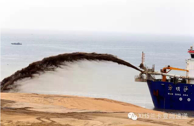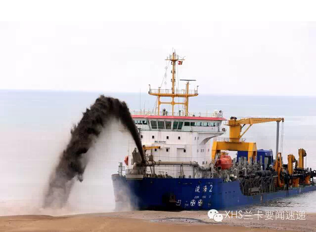 正在現(xiàn)場(chǎng)指揮作業(yè)的中交四航局港口城項(xiàng)目部項(xiàng)目經(jīng)理?xiàng)钕残巯蛴浾呓榻B,中國(guó)交建兩條萬噸級(jí)挖泥船“浚海2”和“萬頃沙”正在進(jìn)行緊張的吹填作業(yè),這兩艘大型挖泥船24小時(shí)不間斷作業(yè),從距海岸十幾海里遠(yuǎn)的海底耙吸取沙運(yùn)到近海岸吹填,目前已吹填出23萬平方米新陸地。記者在現(xiàn)場(chǎng)看到,在靠近招商局投資建設(shè)的科倫坡南港碼頭一側(cè),“浚海2”正在吹填作業(yè),船頭噴出的一道巨大“沙龍”在空中劃出一道完美弧線后墜落近岸,使滄海桑田變?yōu)楝F(xiàn)實(shí),新陸域一點(diǎn)點(diǎn)向遠(yuǎn)海擴(kuò)展。
