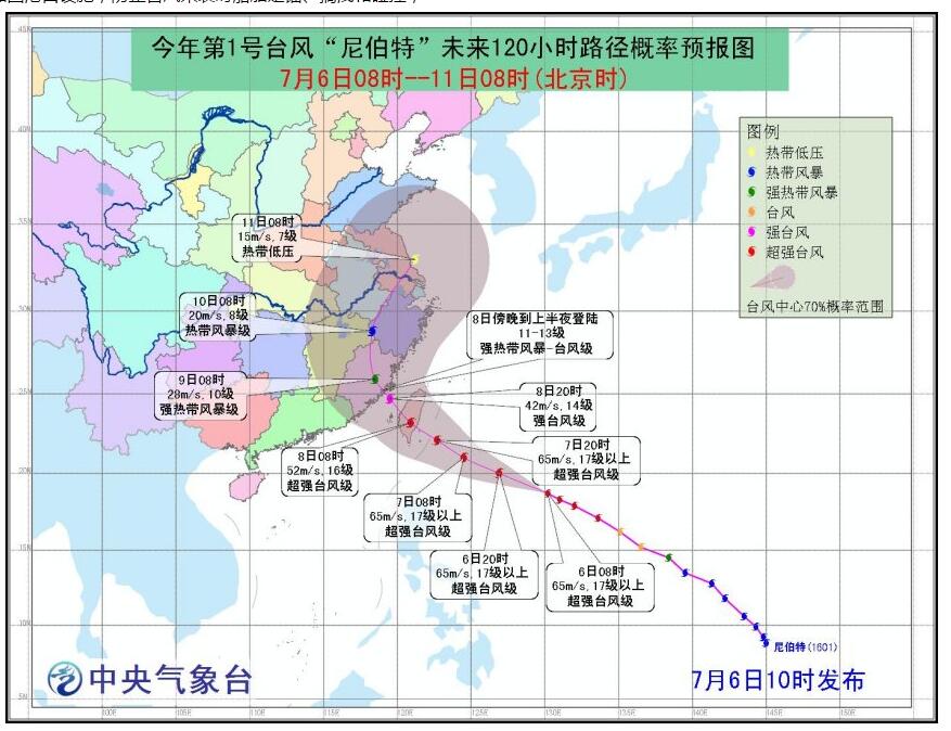預(yù)計(jì) “尼伯特”將以每小時(shí)30公里左右的速度向西偏北方向移動(dòng),強(qiáng)度變化不大或略有增強(qiáng),逐漸向臺灣東部沿??拷?,將于7日夜間到8日凌晨登陸臺灣東部沿海(52~60米/秒,16~17級,超強(qiáng)臺風(fēng)級),登陸臺灣后強(qiáng)度將明顯減弱;之后將穿過臺灣海峽向福建沿??拷?,并于8日傍晚到上半夜登陸福建沿海(30~38米/秒,11~13級,強(qiáng)熱帶風(fēng)暴級到臺風(fēng)級)。