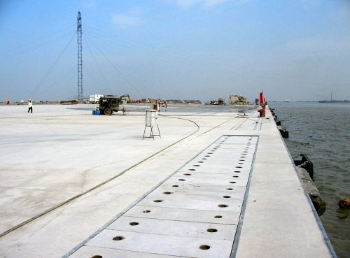 該工程是廣州豐田汽車廠的專用碼頭,也是目前全國最大的汽車滾裝出運碼頭。二公司承擔其中兩個3萬噸級泊位施工,岸線長約404米。碼頭后方為鋼筋混凝土汽車堆場及附屬設(shè)施。