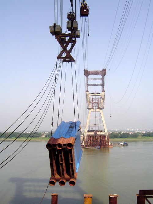 橫跨湘江的四大橋其主跨鋼管拱跨徑為400米,吊裝采用無支架纜索吊裝技術,為確保吊裝安全質(zhì)量、節(jié)約成本,一公司湘潭大橋項目部創(chuàng)新技術優(yōu)勢,取消了水中主錨錠,改由利用邊拱梁作為纜索的主錨,節(jié)約了近4000立方米混凝土;同時克服了主錨仰角(42度)過大(規(guī)范要求為22~25度)和水上高空安裝等技術難題,大大提高了吊裝系統(tǒng)的安全系數(shù)。