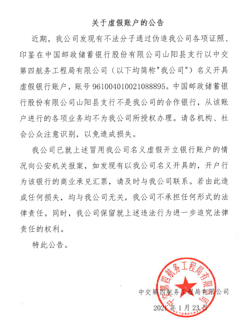 近期,我公司發(fā)現(xiàn)有不法分子通過(guò)偽造我公司各項(xiàng)證照、印鑒在中國(guó)郵政儲(chǔ)蓄銀行股份有限公司山陽(yáng)縣支行以中交第四航務(wù)工程局有限公司(以下均簡(jiǎn)稱"我公司")名義開(kāi)具虛假銀行賬戶,賬號(hào)961004010021088895。中國(guó)郵政儲(chǔ)蓄銀行股份有限公司山陽(yáng)縣支行不是我公司的合作銀行,從該賬戶進(jìn)行的各項(xiàng)業(yè)務(wù)均不為我公司所授權(quán)辦理。請(qǐng)各機(jī)構(gòu)、社會(huì)公眾注意識(shí)別,以免造成損失。