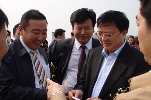 5董事長 黨委書記梁卓仁 總經(jīng)理孫國強 一公司經(jīng)理方嘉煊項目公司經(jīng)理李寶鋒 書記謝騰文 與湘潭市委書記陳潤兒在大橋工地