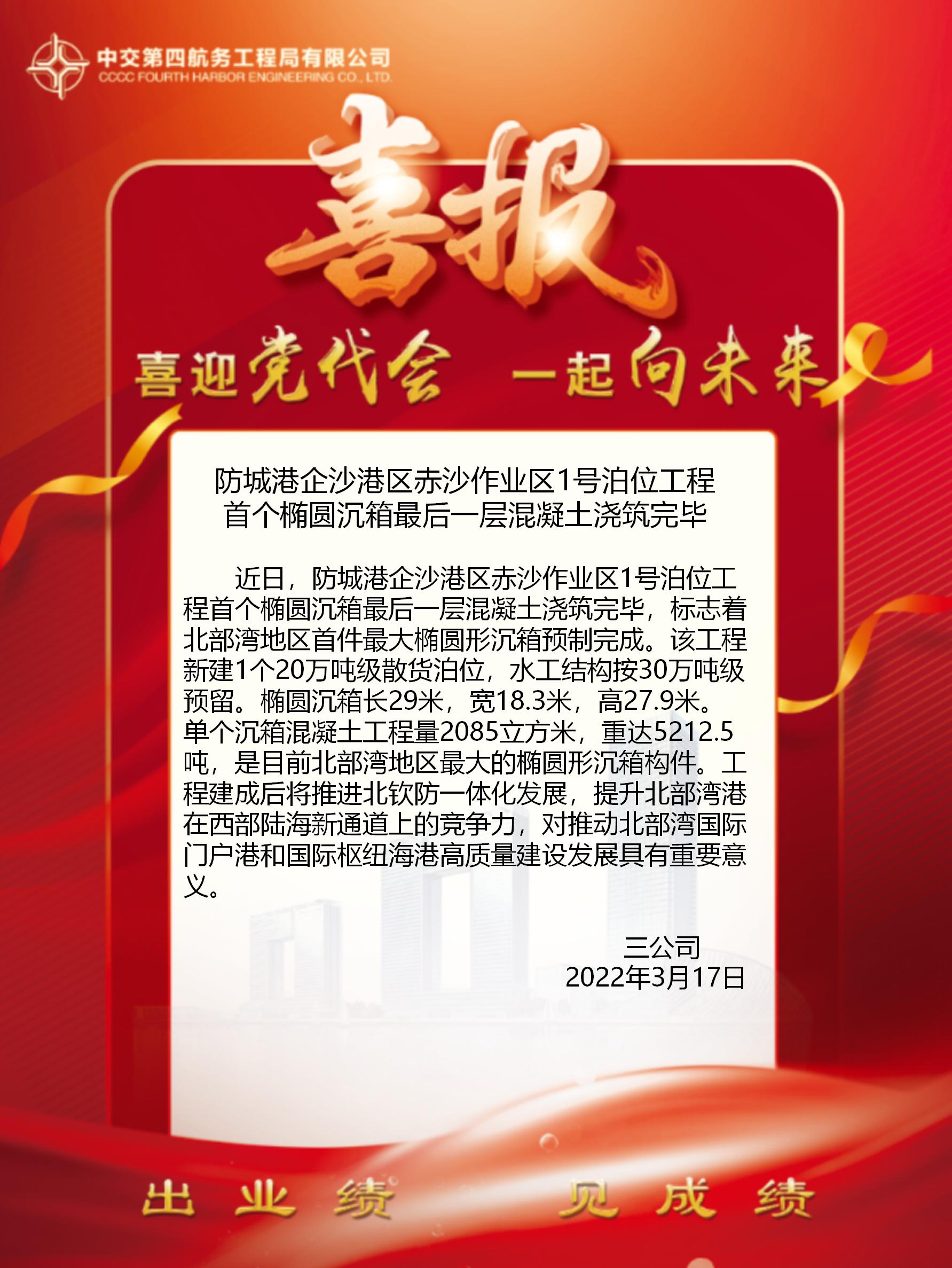 防城港企沙港區(qū)赤沙作業(yè)區(qū)1號(hào)泊位工程 首個(gè)橢圓沉箱最后一層混凝土澆筑完畢