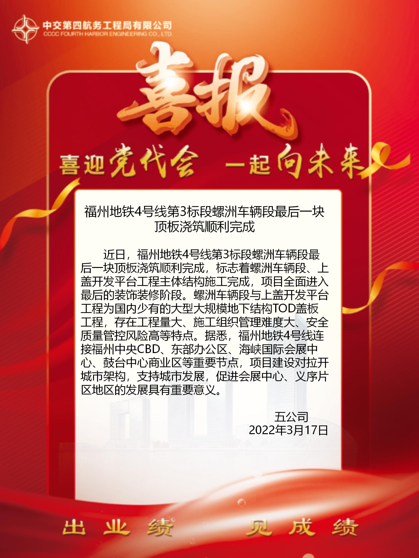 福州地鐵4號線第3標(biāo)段螺洲車輛段最后一塊頂板澆筑順利完成