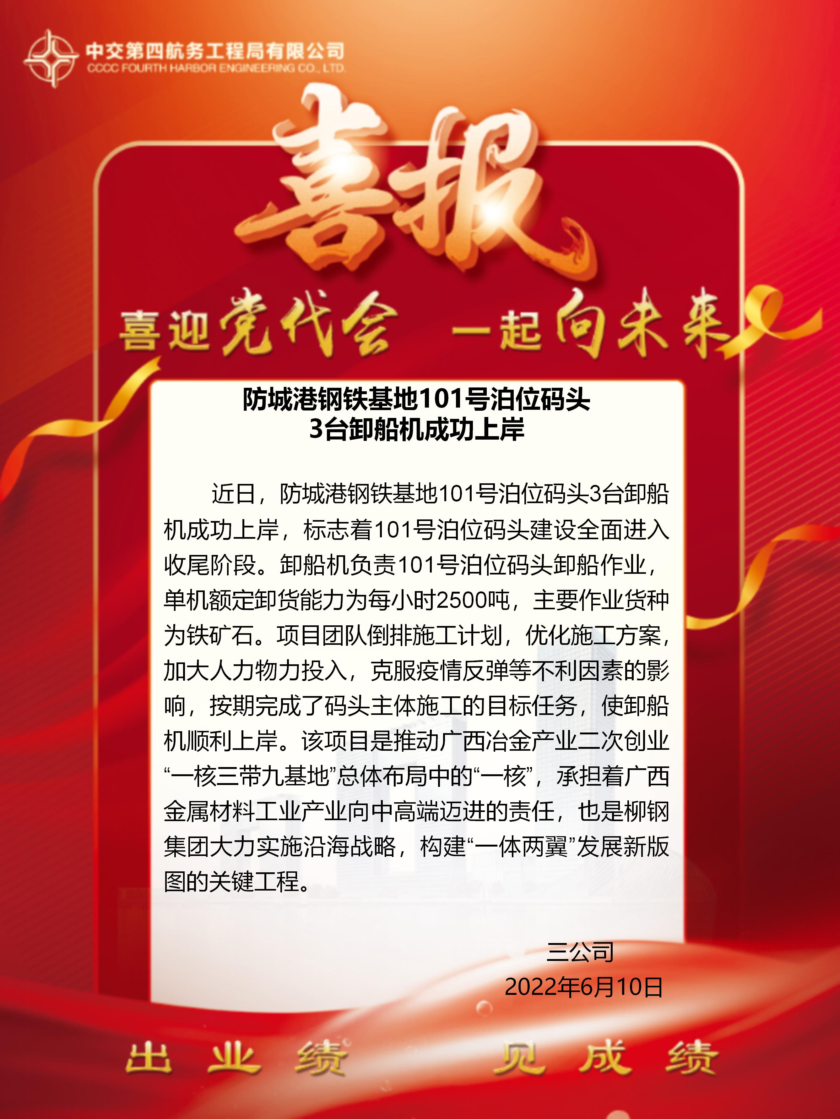 防城港鋼鐵基地101號(hào)泊位碼頭3臺(tái)卸船機(jī)成功上岸